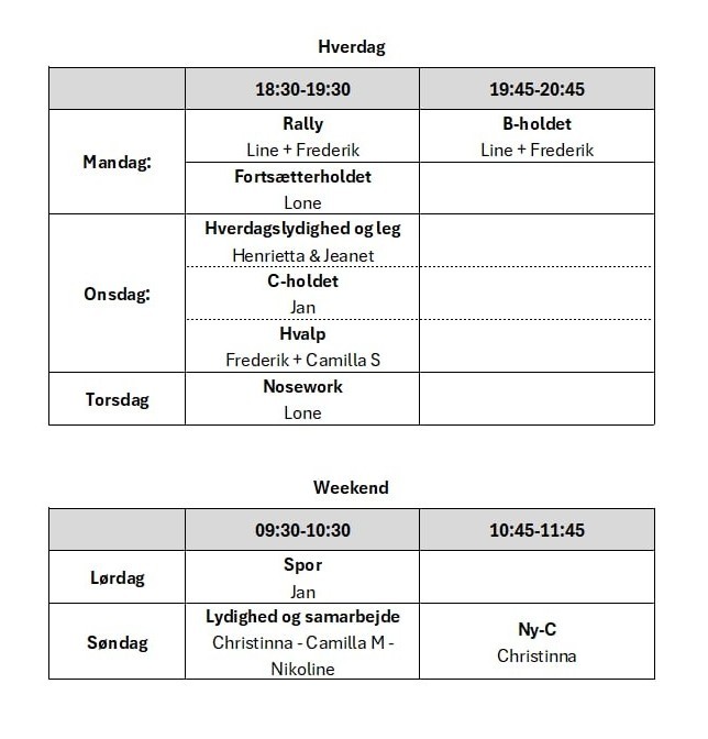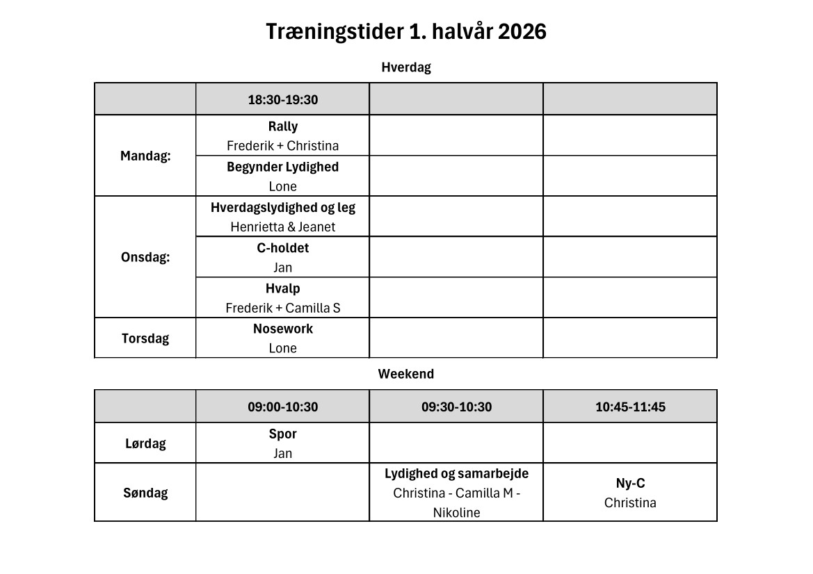 Træningstider fra 26/1-26 og frem til og med uge 26